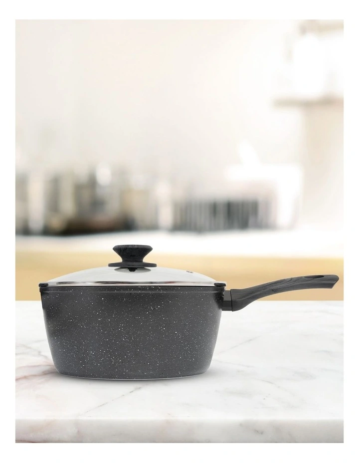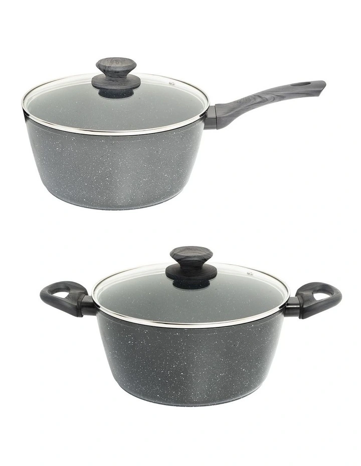 Whip up a delicious stew, or boil veggies, pasta and rice with this excellent value nonstick Casserole Pan with lid and Saucepan with lid Set. Made with a healthy PFOA free coating, this set is compatible with gas, electric and induction cooktops, and forged from heavy gauge aluminium.Â