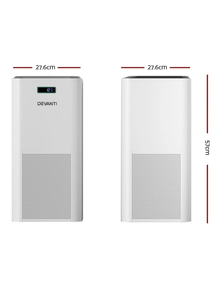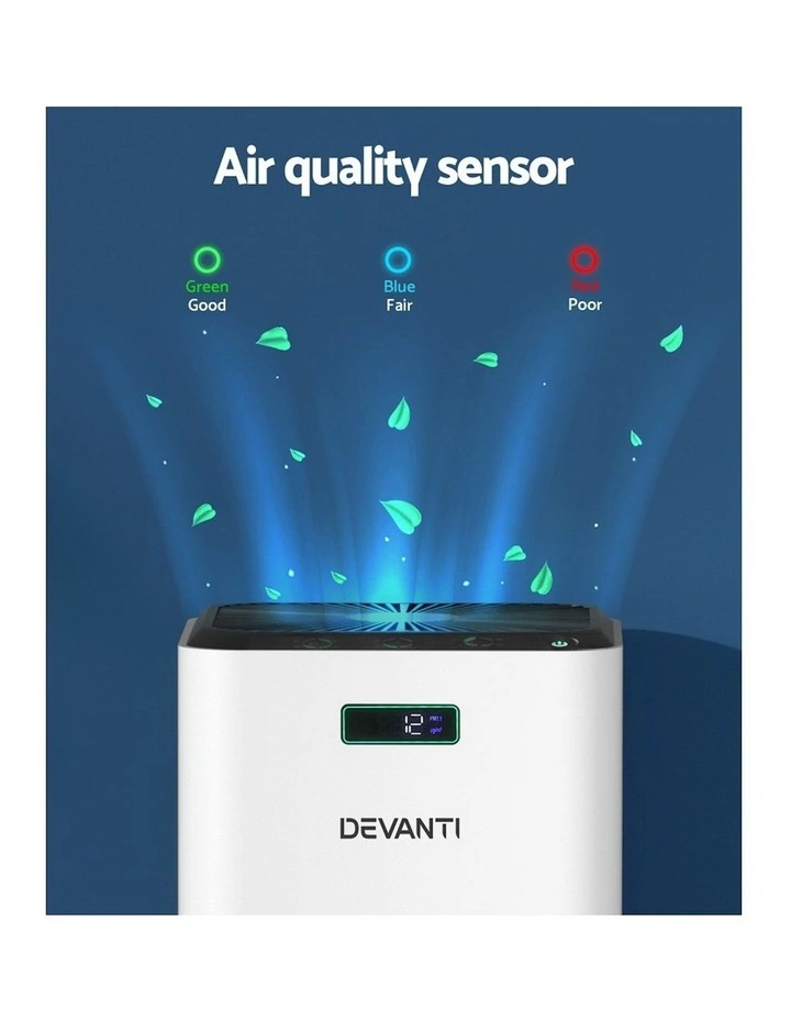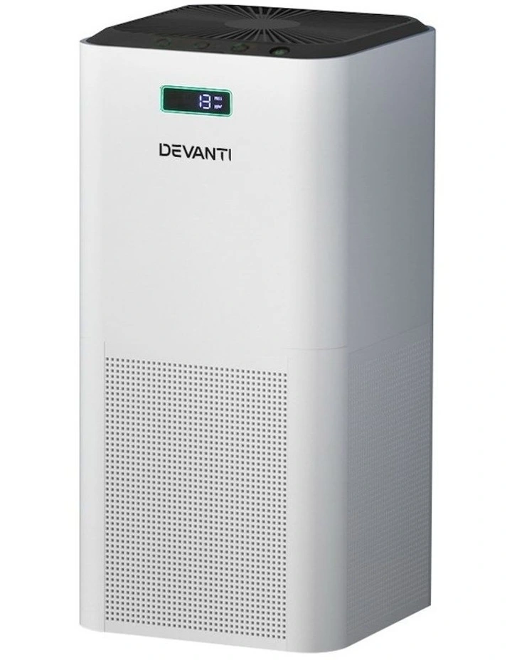 Is your air quality not where you want it to be? Whether its allergens or bad odours, sometimes you just need a breath of fresh air. Remove pollutants from your home and breathe easy with a Devanti Air Purifier. The air purifier features a 3-layer filtration system to remove up to 99.97% of allergens and dust from your home, as well as remove common volatile organic compounds (VOCs) from the air. The pre-filter layer and built-in ionizer catch large particles such as dust, dander and hair before the air travels through an H-11 grade HEPA filtration layer, and finally, an activated carbon layer that removes hard-to-get VOCs and bacteria. The air purifier has excellent coverage and a CADR rating of 400m per hour, making it able to quickly purify areas up to 48m. Set it to auto mode and let it automatically adjust airflow to suit your space or set an 8-hour timer for total control. Worried about the noise levels? Use sleep mode for the quietest and least distracting operation. Continually monitor your air quality with the intuitive sensor and know when to replace your filter with the filter change indicator. Finally, the clear PM2.5 display makes using this air purifier as easy as breathing. Buy your Devanti Air Purifier today and enjoy clear air tomorrow.