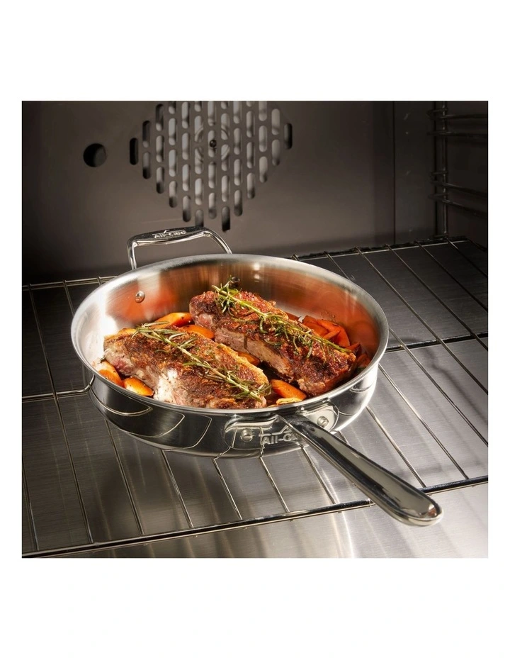 Deeper than a traditional fry pan, this All-Clad d5 STAINLESS Polished SD55403 3Q/2.8L/23cm saut pan features a large surface area and tall, straight sides that hold in juices, prevent splattering, and allow for easy turning with a spatula. Ideal for a wide range of foods including chicken breasts and fish fillets, the saut pan offers the convenience of browning or searing, then deglazing or finishing in liquid; all in one pan. The lid locks in moisture and heat to thoroughly finish meats on the stove top or in the oven.