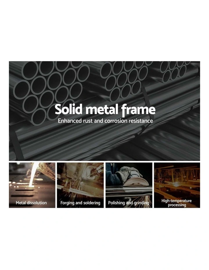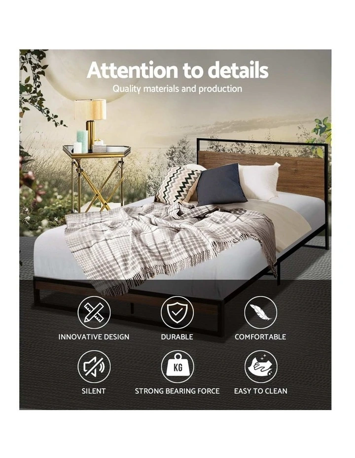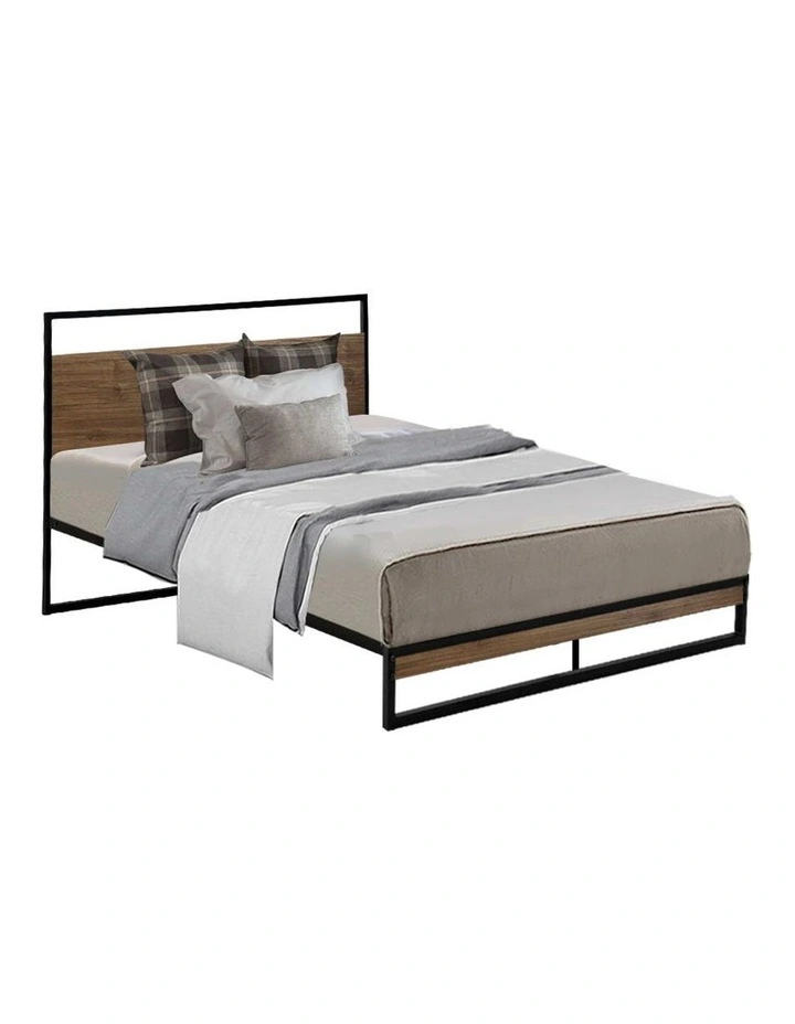 Metal and wood in perfect harmony. Our Dane Bed Frame is truly a stylish addition to any bedroom. Simple in design, the bed frame is meticulously constructed in sturdy steel and 15mm thick MDF with PVC for durability and strength. The sleek black powder-coated steel and dark wood accents lend real industrial cred to your bedroom for some standout dcor. Across the frame, evenly spaced slats provide good weight distribution as well as ensuring that the mattress stays in place even with every twist and turn of your sleep. The central support beam further steadies the bed under robust use. Designed to fit standard size mattresses effortlessly, our eclectic bed frame is guaranteed to give you pleasant dreams with every sleep.