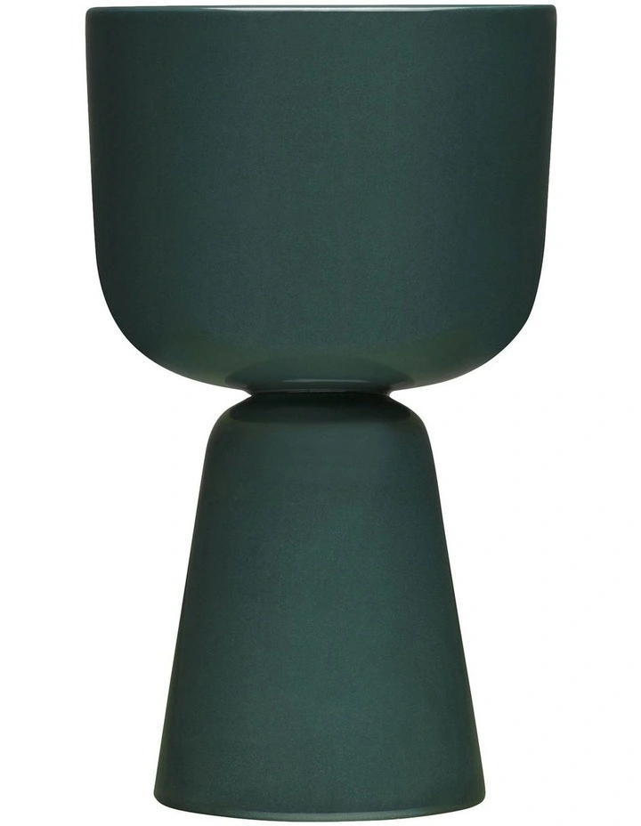 A tables awkward shape and swollen legs were designer Matti Klenells inspiration for Nappulas signature silhouette. Now a modern Nordic design classic, the Nappula plant pot features a fun play on the signature silhouette with its flowing curved design. The larger size displays plants beautifully in any interior. A true inspiration for green displays that allows you to bring the outdoors in. Dark green highlights the minimalist design. Striking alone or grouped. A perfect gift.