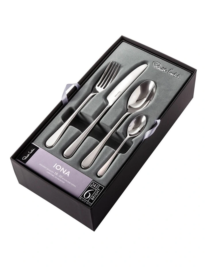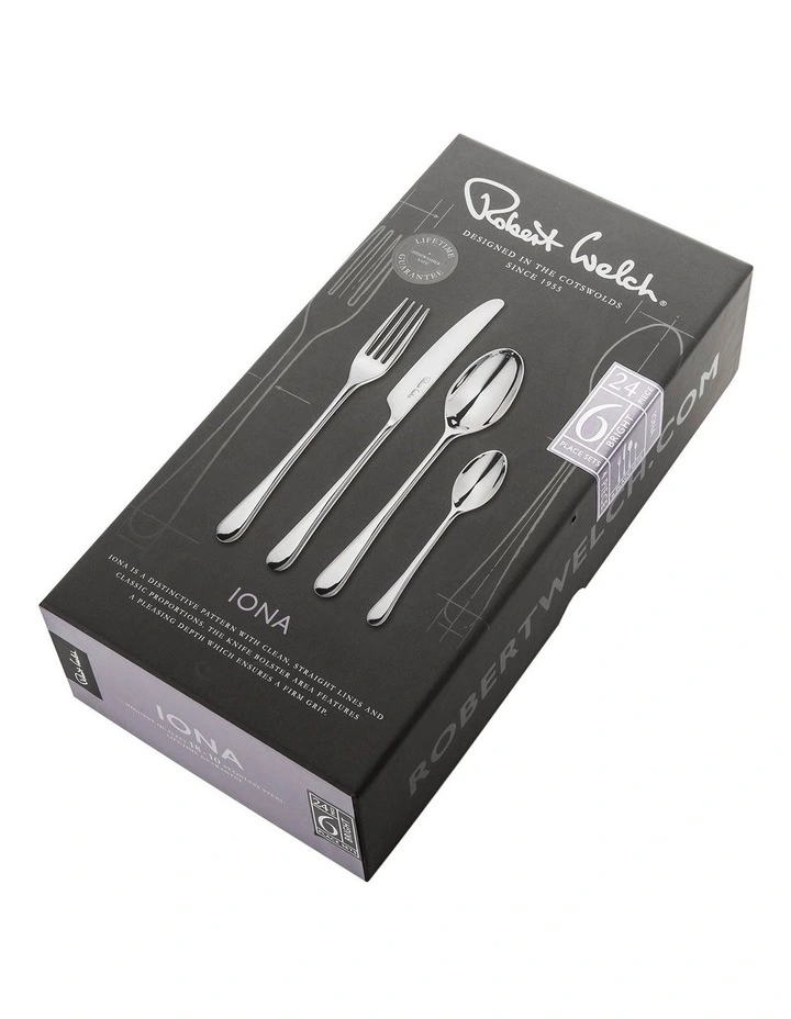 Iona cutlery has a slim and elegant profile providing surprising balance and comfort when in use. Spoons and forks are made using the highest quality 18/10 stainless steel. Knife blades are made from specially hardened stainless steel to provide the finest possible cutting edge. All Iona cutlery is available with a mirror finish, has a lifetime guarantee and is dishwasher safe. Consists of Table Knife (6), Table Fork (6), Soup Spoon (6), Teaspoon (6)