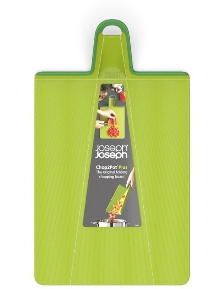 Chop2Pot Plus is the original folding chopping board that makes food transfer easy. Laid flat, it provides a knife-friendly and non-slip cutting surface for all types of food preparation. But when the handle is squeezed, the sides of the board fold up, forming a convenient chute down which chopped food or waste can be neatly guided. Cutting area: 34.5 x 26 cm (13.5 x 10.2 inches). Dishwasher safe.