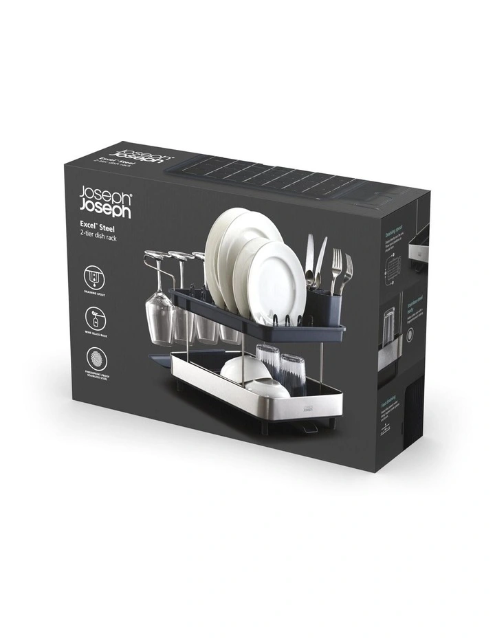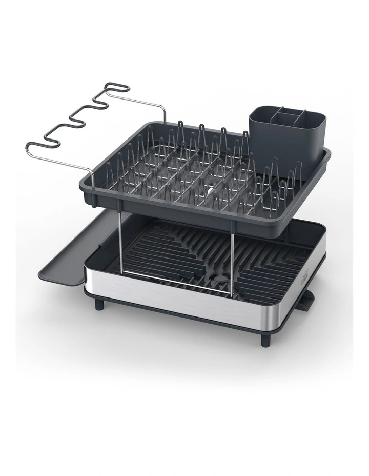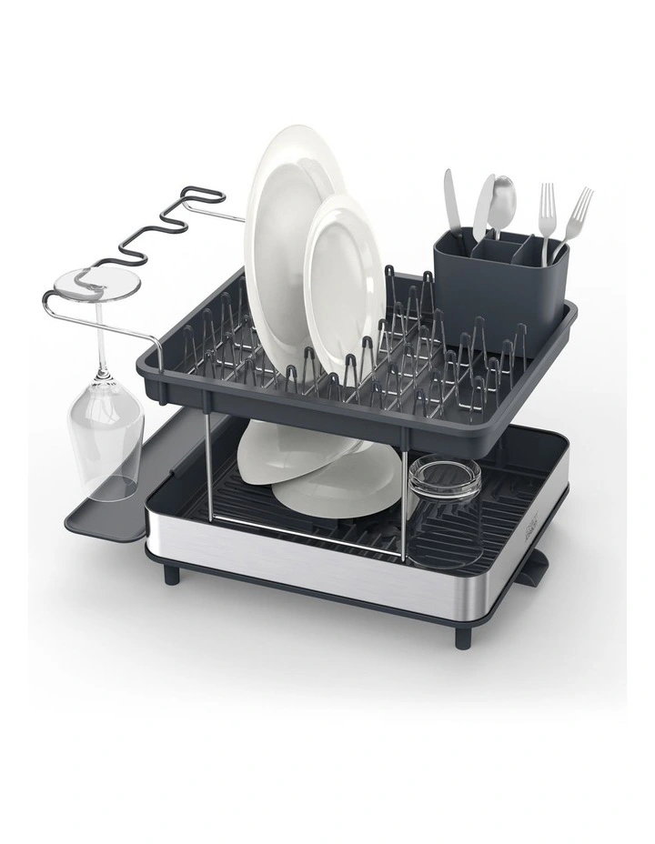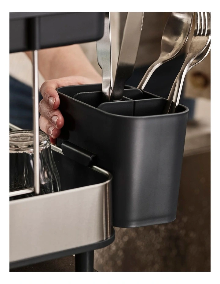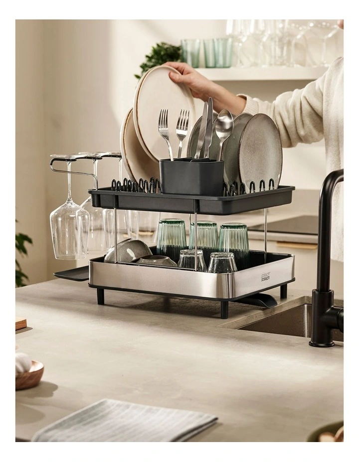 With room around the sink at a premium, this smart dish rack maximises every inch of available space. It features a two-tier design, allowing you to stack lots of washing up in a small footprint and a wine glass holder for safely draining delicate glassware. The moveable cutlery holder can store either inside the top rack or be hooked onto the outside of the lower rack for extra draining space.