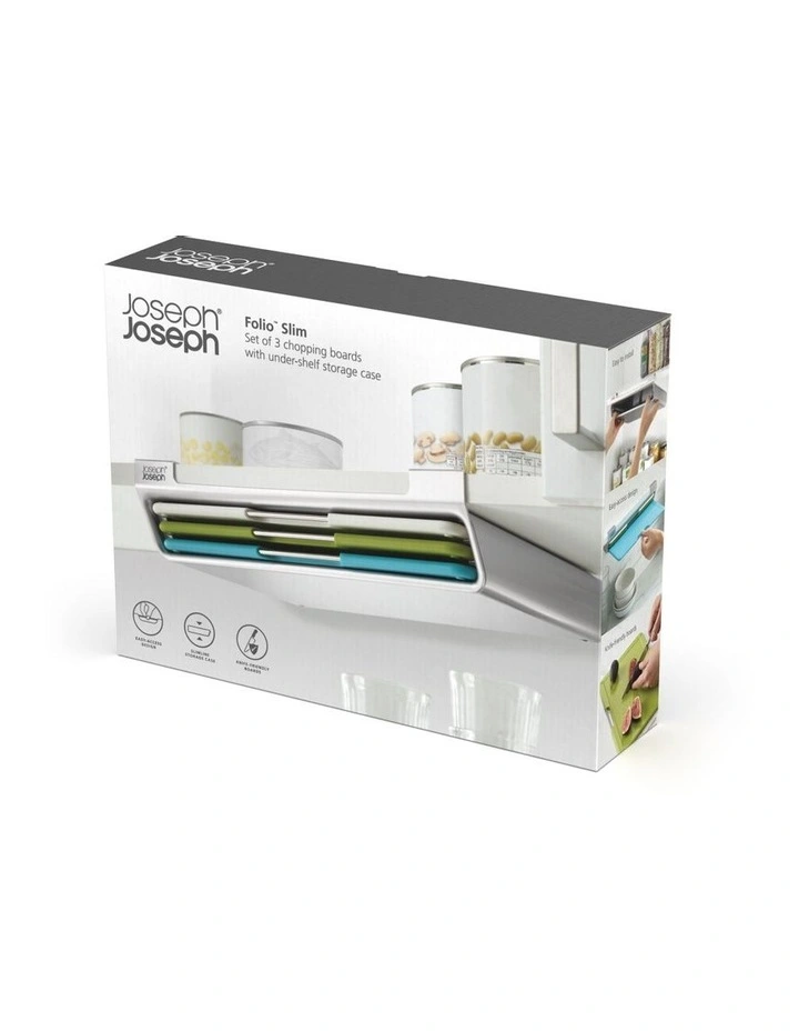 This innovative chopping board set makes great use of wasted space beneath the shelf, thereby maximising every inch of cupboard area. The set includes three colour-coded chopping boards with knife-friendly, textured cutting surfaces on both sides, stainless-steel selecting bars and non-slip feet. These are held inside a slimline storage case that hooks onto your existing shelf and is secured at the back with two small screws (included). The case can be mounted either inside the cupboard or beneath and has a tiered design making the boards easy to select.
