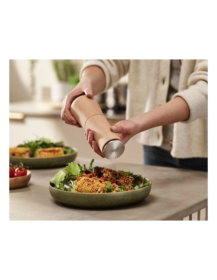 Conventional salt & pepper mills often create mess by leaving excess grounds on surfaces when placed down. The simple, elegant design of Milltop Wood avoids this problem as the grinding mechanism is at the top of the mill, which means any excess grounds fall back inside the unit after use. To use, simply hold the mill at an angle and twist the base to grind and to adjust the grinding size, rotate the stainless-steel top. Made from beautiful, natural beech wood, the design also features a tough, ceramic grinding mechanism and is very easy to fill via a twist-off base. Wipe clean with a damp cloth.