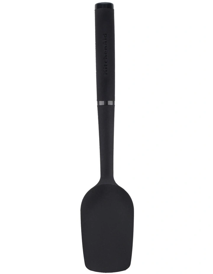 The KitchenAid Soft Touch Spoon Spatula is made from flexible silicone with a slight bowl and curved edges, a versatile utensil ideal for any home cook. The handle is finished in matte black with an embossed logo.
