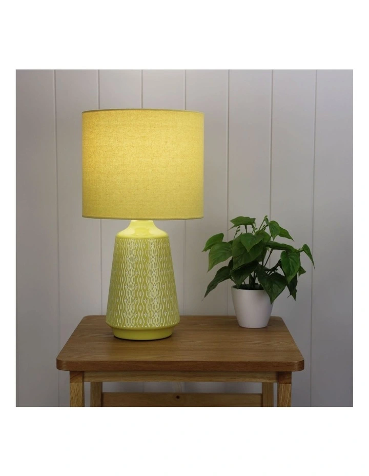The Moana yellow ceramic table lamp comes complete with a yellow drum shade. The Moana is a stylish table lamp destined for the bedroom or study. The on/off switch is located conveniently on the cord.