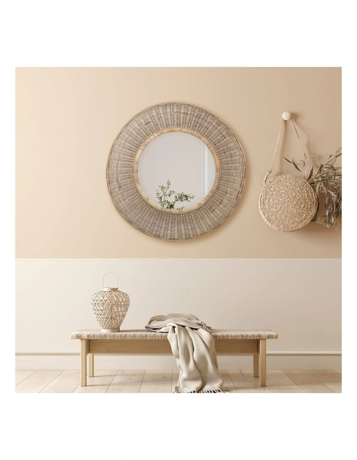 The Moonah Round Rattan Wall Mirror is more than a pit stop to check your look before you run out the door. This large mirror brightens your space, add more detail to the room and visually expand the area it’s placed in. And at 90cm in height, this wall mirror is the perfect wall piece to create a feeling of depth in any room while enhancing the light from lamps, candles and windows.
