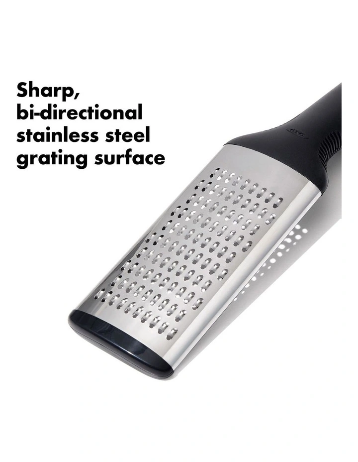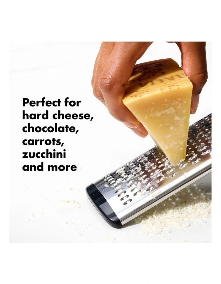 The Oxo Good Grips Grater features a stainless steel head that yields finely grated citrus zest, chocolate, hard cheeses, and more. The soft handle absorbs pressure so your hands don’t have to and the non-slip feet keep the Grater steady while you work.