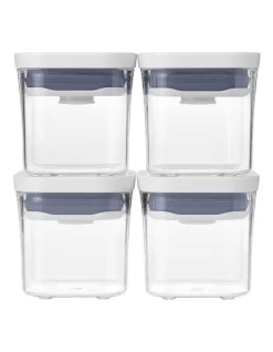 Oxo Good Grips 4 Piece Mini Pop Container Set. Stackable and space-efficient, POP Containers are designed for modular use, so you can organize in any number of height combinations to fit your countertop and pantry. Push-button mechanism creates an airtight seal with just one touch. Lids and body Dishwasher safe. Set includes 4 x 200ml Containers.
