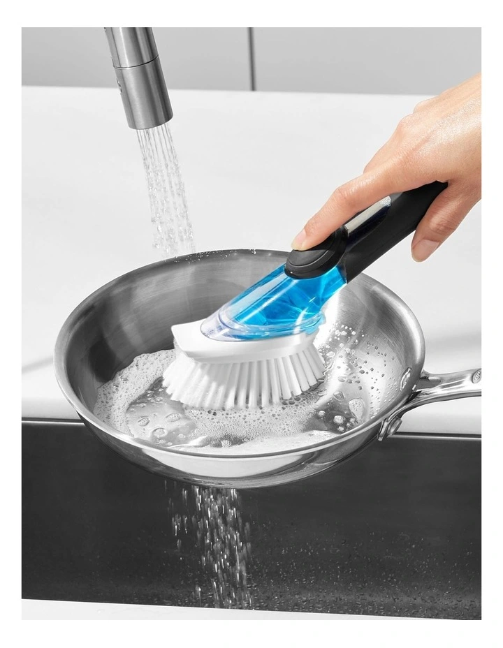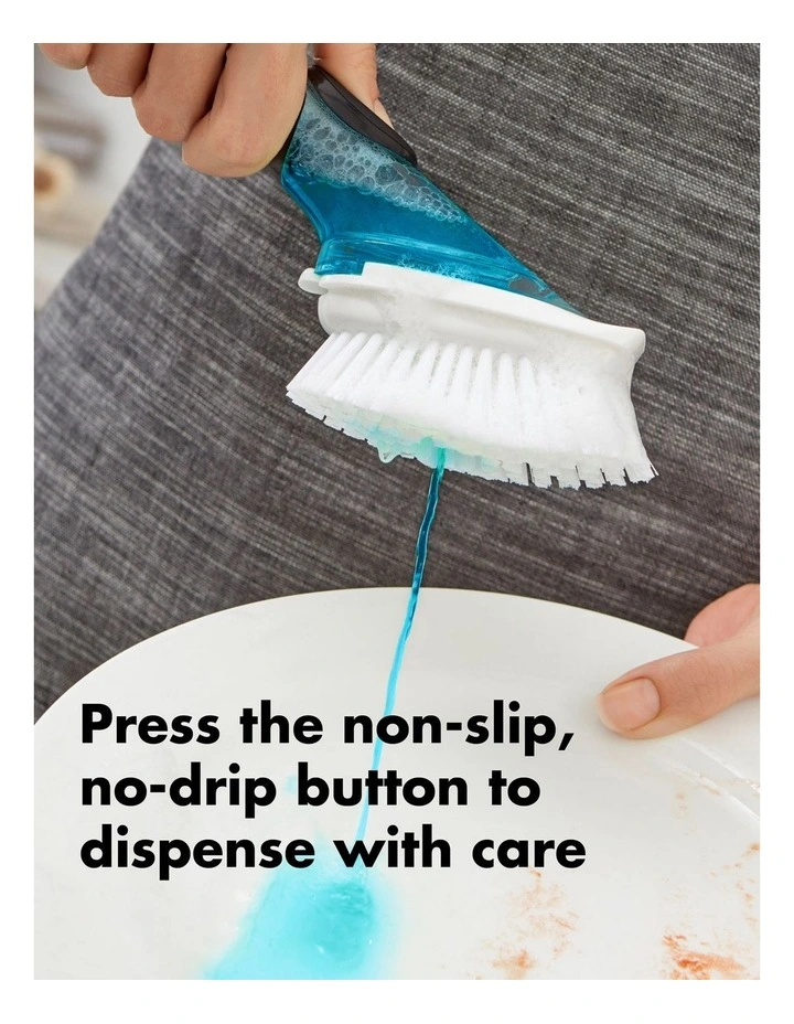 With a light push of the soft, non-slip button, the silicone valve shoots soap onto your dishes, then quickly seals to prevent drips and waste. Includes a scraper on back to remove baked-on food. Durable nylon bristles are safe for non-stick cookware and bakeware.