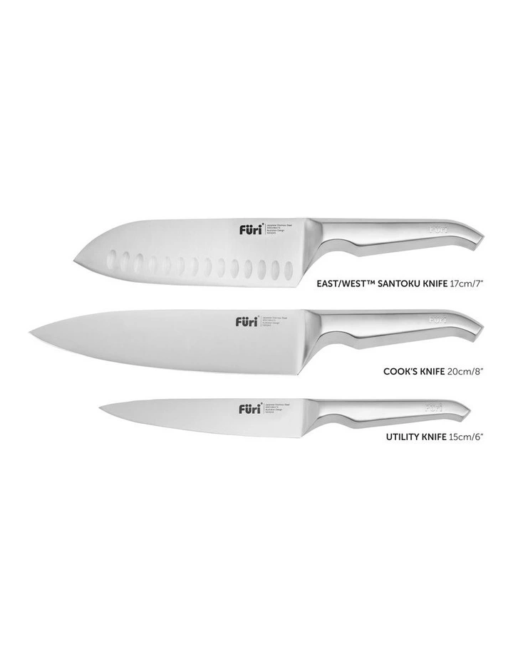 - Contains Cook’s 20cm (8 inch), East/West Santoku 17cm (7 inch), and Utility 15cm (6 inch) knives