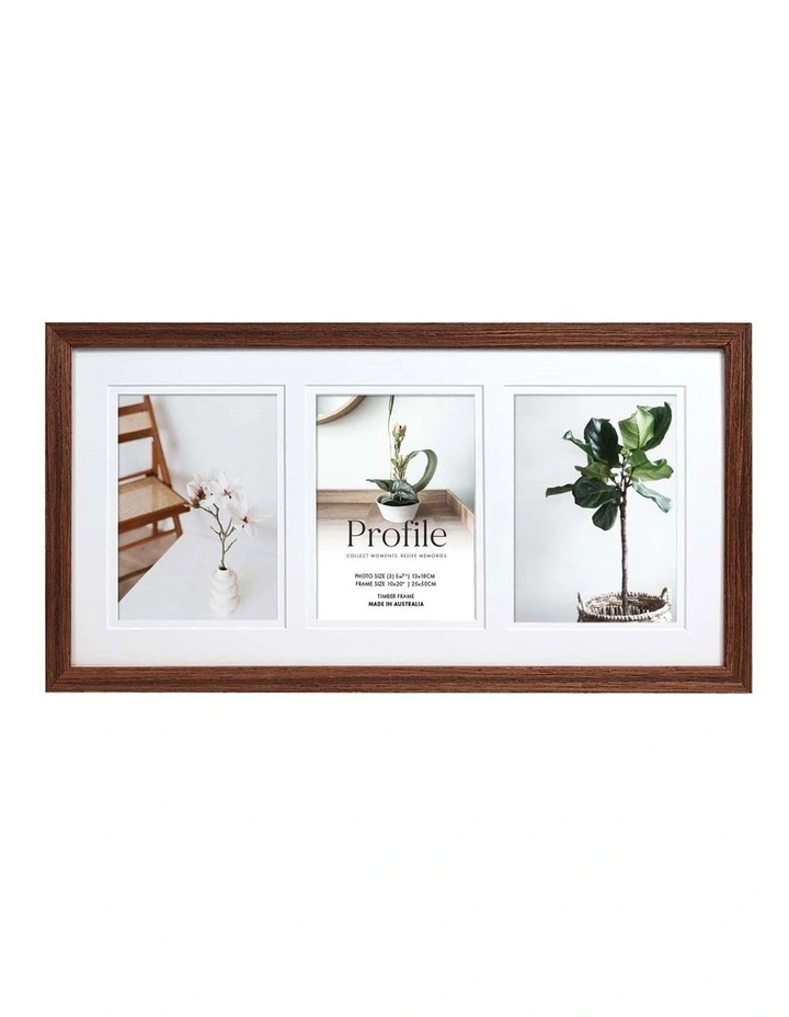 The Deluxe Chestnut ranges are proudly Australian Made with eco sustainable timber and comes with a lifetime guarantee. The Chestnut coloured moulding is 20mm wide and 20mm in depth and can be hang on any flat surface. This particular photo frame (also referred to a collage or Galley frame) fits three (3) 5X7″ (13X18cm) photos using the double acid free matboard or a 10X20″ (25x50cm) panoramic photo when the matboard is easily removed.