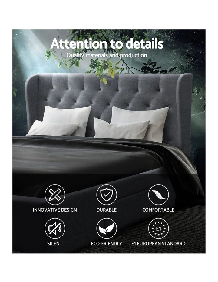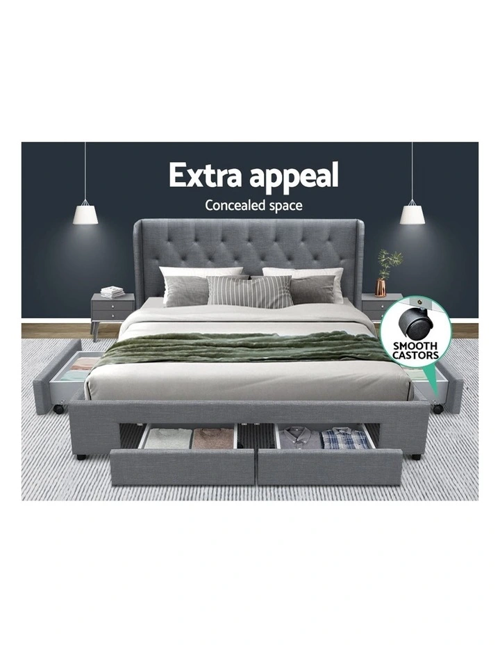 Of particular interest is the tufted headboard that really gives the Bed Frame a designer-class status. Simply oozing with elegance and sophistication in every detail. Whats more, underneath the Bed Frame, youll find four spacious drawers to store all your seasonal beddings and linen and a host of other personal essentials. No more clutter and loads of useable storage right under you. Better still, the drawers are set on wheels for easy access sliding in and out.