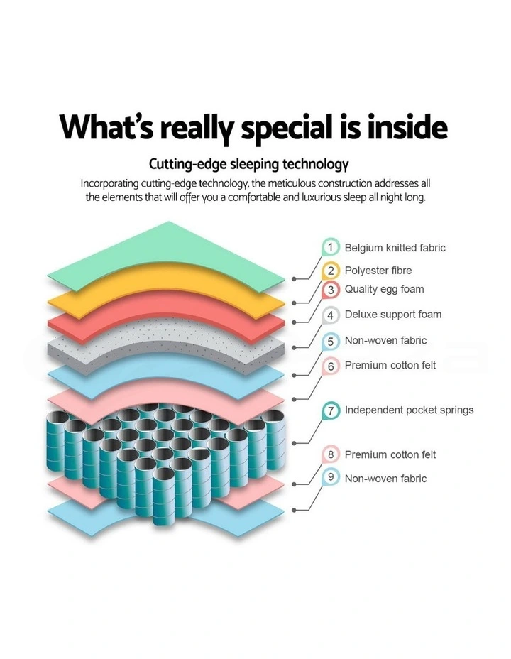 Covered with premium Belgium knitted fabric for unsurpassed softness and body heat dissipation, the Giselle Bedding Firm Mattress is also highly breathable and dust mite and mould-resistant with no necessity to turn over the mattress unlike other inferior alternatives. Handy side handles enables you to position the mattress easily.