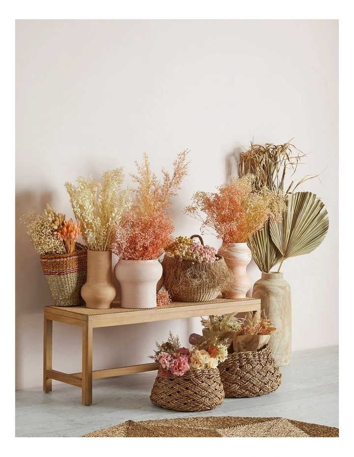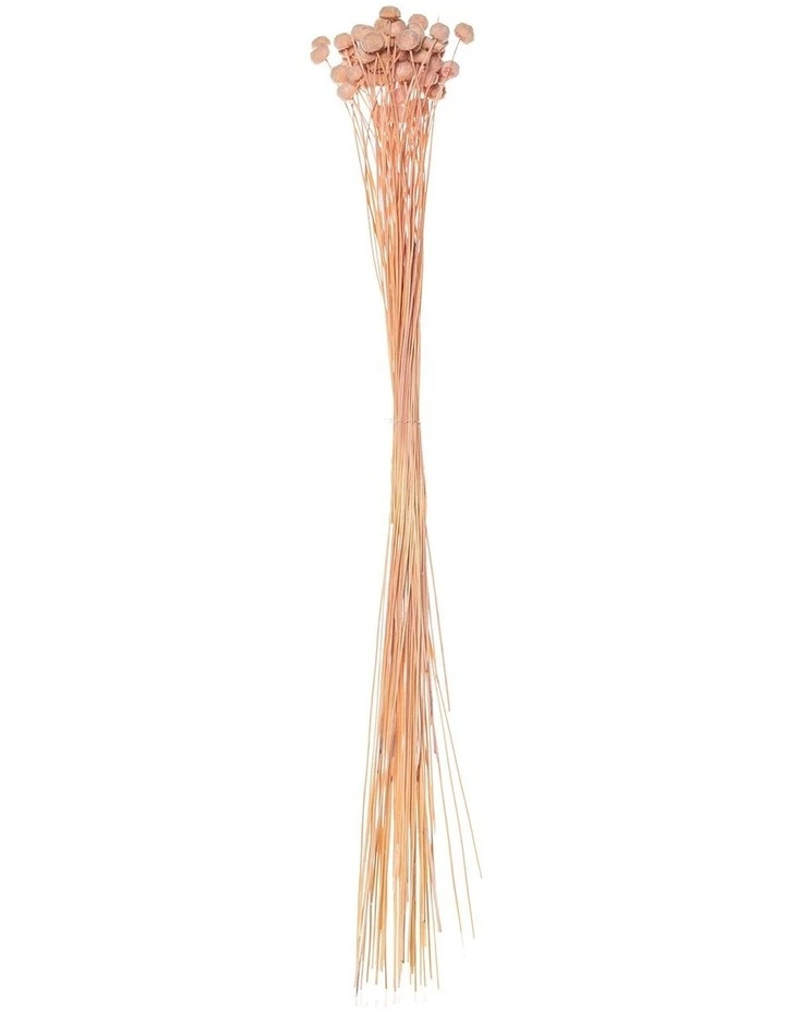 This charming bundle of button chrysanthemums is a natural product that has been preserved through a special process. The stems and sweet, rounded flower heads have been coloured soft pink for a vibrant and warm look. As dried flowers are so on trend, these stems will look glorious in a slender vase of their own. Or use them for colour, texture and bulk in a stunning dried flower arrangement.Â
