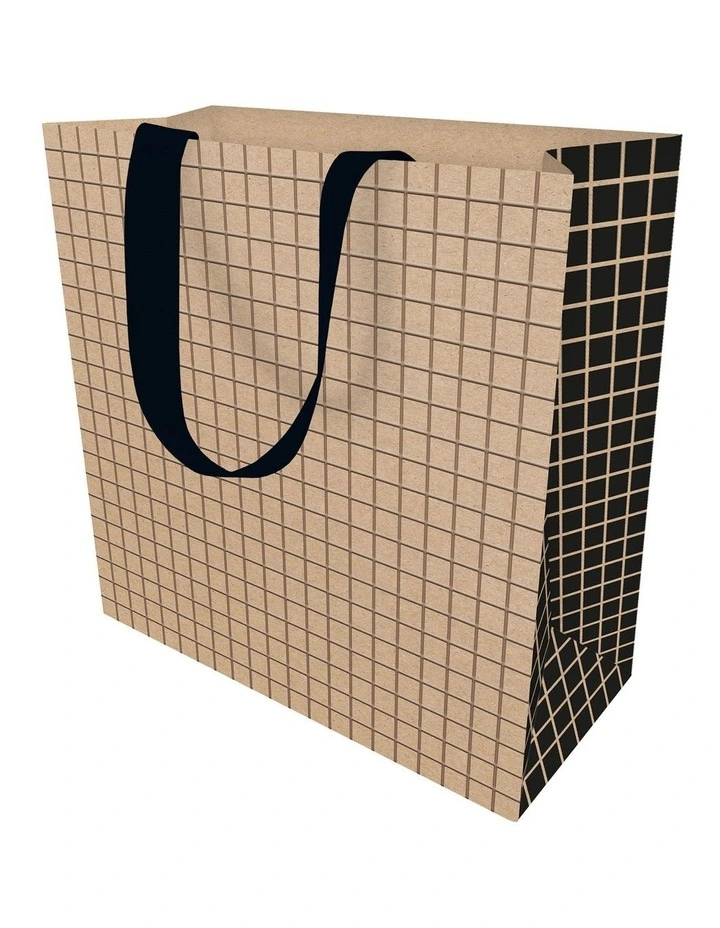 - Black ribbon handles and a black checkerboard gusset