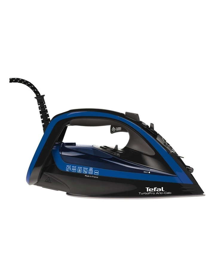 Tefal Turbopro Airglide Iron:Black/Blue. Turbopro anti-calc is equipped with the new tefal turbo boost technology for steam propulsion that drives deep into fabric to remove even the most stubborn creases. It is equipped with revolutionary airglide soleplate that ensures effortless ironing that will cut your ironing time significantly. Finally, it features the the scale collector for long-lasting performance. This high-efficiency steam iron delivers fast and flawless ironing results every day. FV5648.