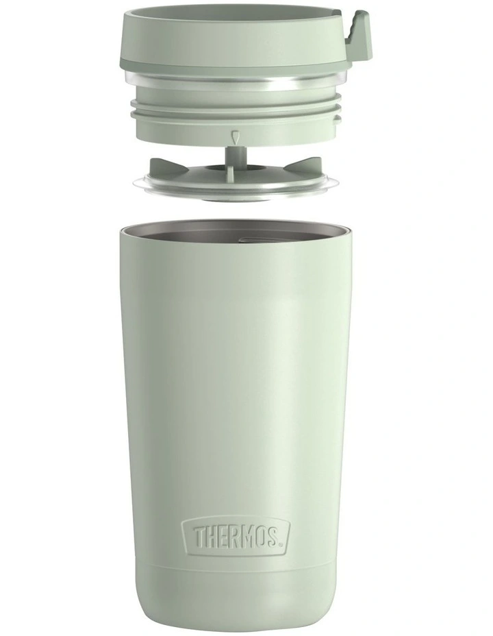 Thermos vacuum insulation technology for maximum temperature retention, keeps hot up to 3 hours or cold up to 10 hours. Durable stainless steel interior & exterior. Cool to touch with hot liquids, sweat proof with cold. Slide Lock Lid is simple & easy to use. Leak Resistant Plunger Lid system easily disassembles for thorough cleaning. Will fit most vehicle cup holders.