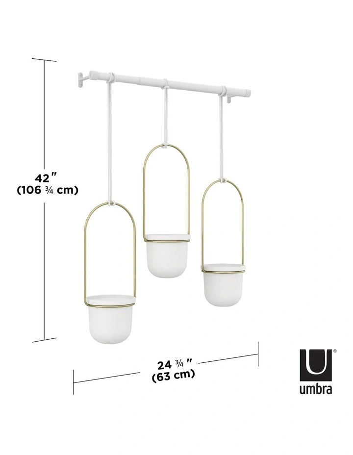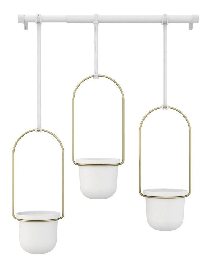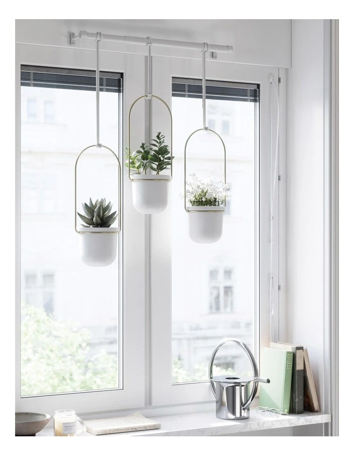 Triflora is a hanging planter for indoor plants that combines the utility of a drapery rod with the beauty of potted plants. Great for herbs, succulents, vine plants and more, Triflora Hanging Planter mounts to your wall or ceiling and adds functionality to your window by turning it into a space for growing plants. You can adjust the length of Trifloras ropes and slide them anywhere along the metal rod to customize the position of each hanging pot. The durable melamine pots can hold 7.62cm diameter pots (so theres no need for re-potting).